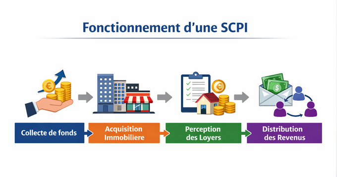 Une SCPI est un véhicule d’investissement collectif qui collecte des fonds auprès d’investisseurs pour acheter et gérer différents actifs immobiliers (bureaux, commerces, santé, logistique, résidentiel…). La société de gestion perçoit les loyers, gère les locataires, arbitre le patrimoine, puis redistribue une partie des revenus aux associés, le plus souvent de manière trimestrielle.