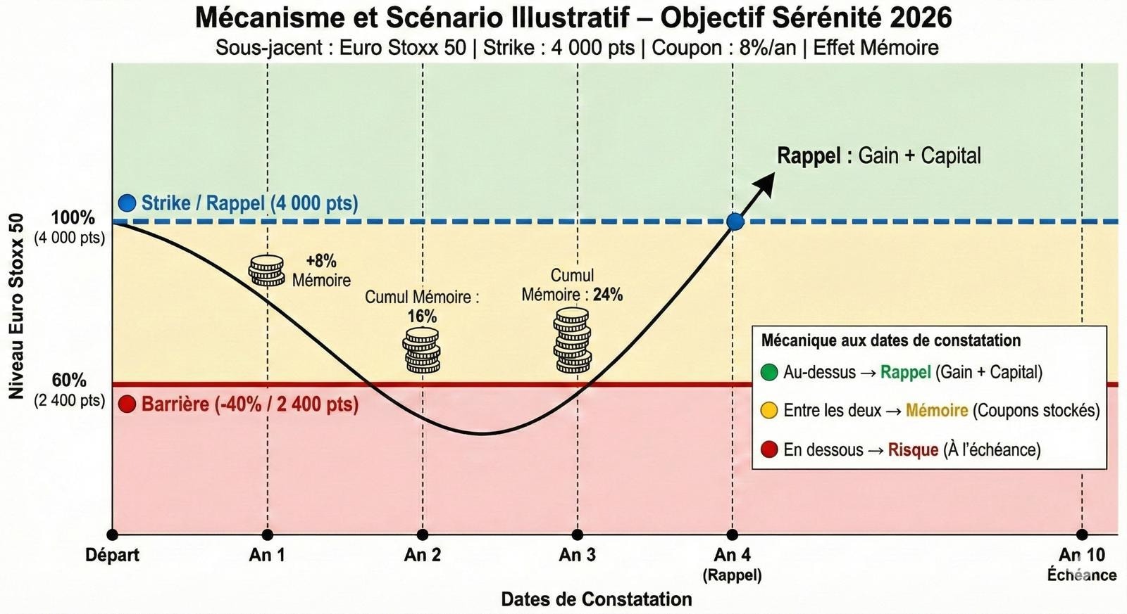 Sous-jacent : Indice Euro Stoxx 50 (les 50 leaders de la zone euro). Niveau initial (Strike) : 4 000 points. Durée maximale : 10 ans. Rendement (Coupon) : 8 % par an. Fréquence d’observation : Annuelle. Barrière de rappel : 100 % du niveau initial (4 000 pts). Barrière de protection du capital : 60 % du niveau initial (protection jusqu’à -40 % de baisse). Mécanisme : Effet Mémoire.