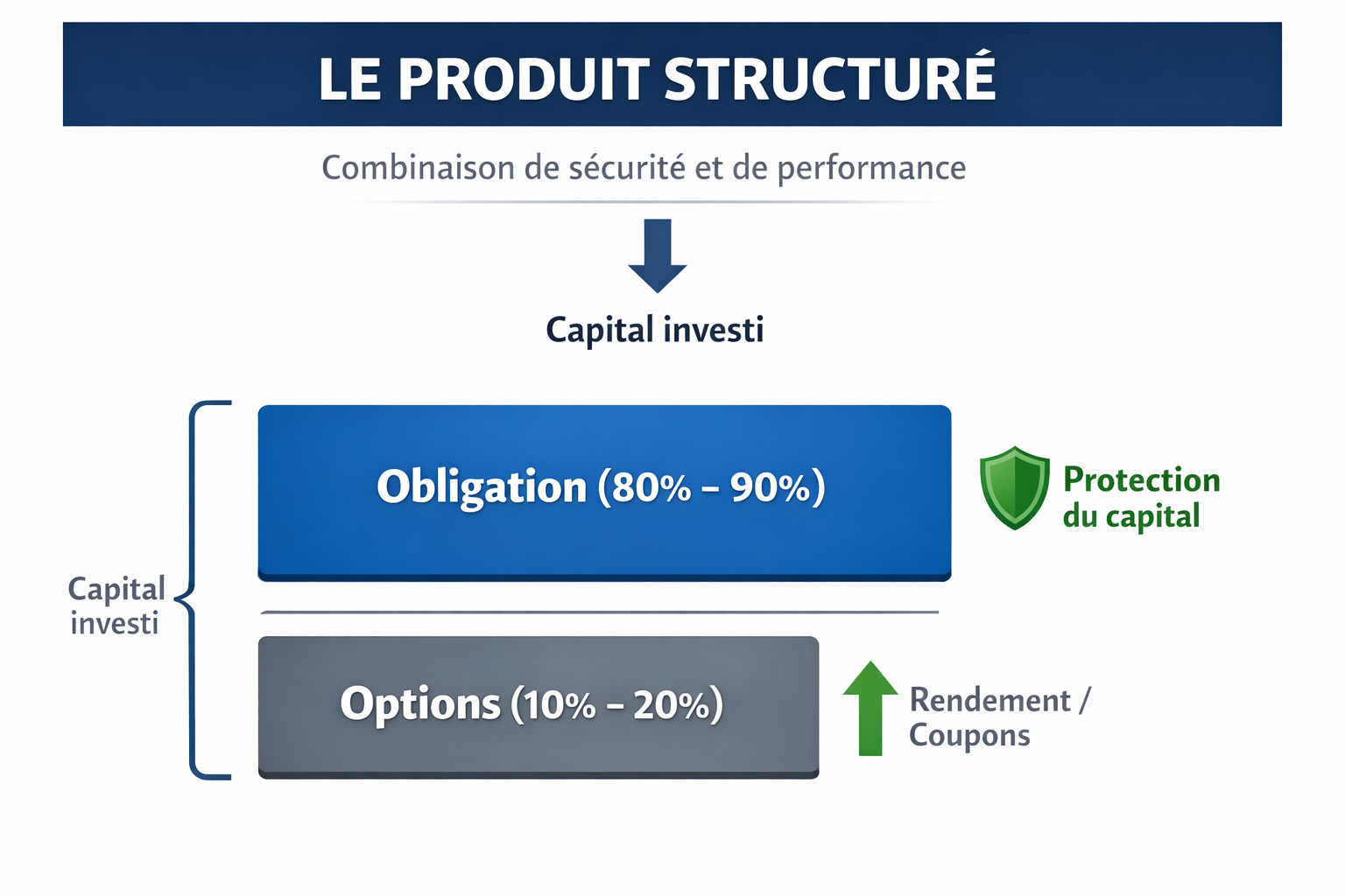 Le terme “structuré” vient du fait que le produit est un assemblage de deux composantes financières. La première est une composante obligataire, c’est-à-dire des obligations, qui représente la majeure partie de l’investissement et sert à assurer la sécurité ou la protection du capital à l’échéance. Cette protection du capital peut être partielle ou totale selon la structure du produit, ce qui permet à l’investisseur d’adapter son niveau de risque. Il est important de noter que la garantie du capital s’applique généralement au capital à l'échéance, c’est-à-dire à la date de maturité du produit, souvent après 5 à 10 ans. La seconde est une composante optionnelle, une fraction du capital investie dans des produits dérivés (options) qui permet de générer la performance promise, même dans des marchés peu directionnels.